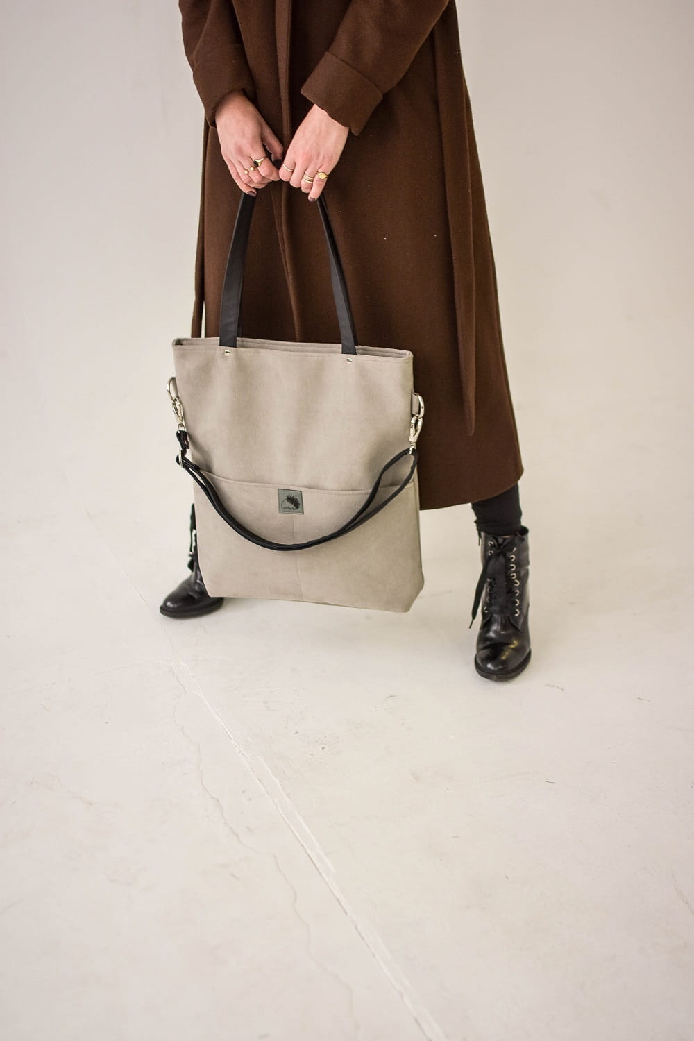 Große, Wildledertasche (steifes, dickes, wasserdichtes Öko-Nubuk) – kann auf der Schulter und diagonal am langen, verstellbaren, zugeknöpften Riemen getragen werden.
