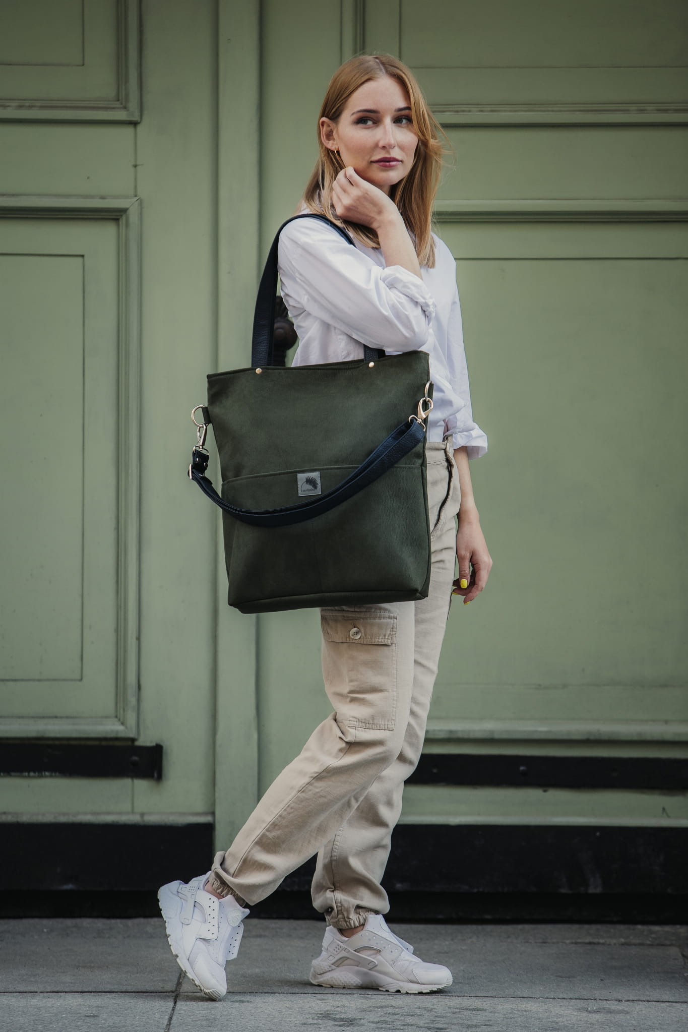 Große, Khaki Wildledertasche (steifes, dickes, wasserdichtes Öko-Nubuk) – kann auf der Schulter und diagonal am langen, verstellbaren, zugeknöpften Riemen getragen werden.