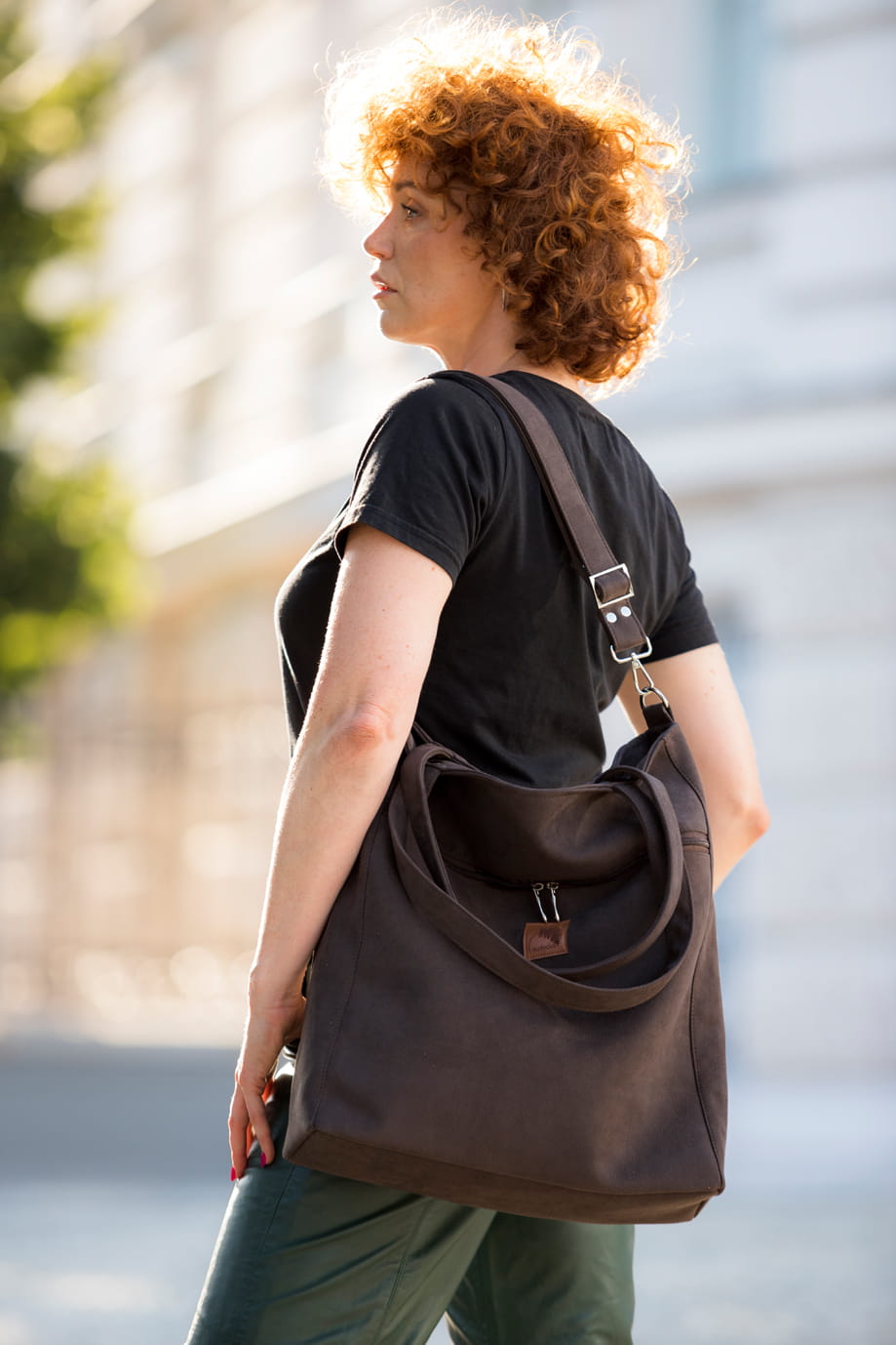 Große TOTE BAG aus Nubuk. Kann auf der Schulter oder diagonal am langen, verstellbaren Riemen getragen werden.