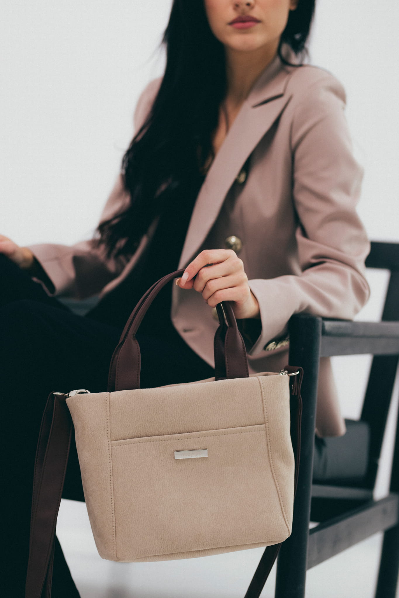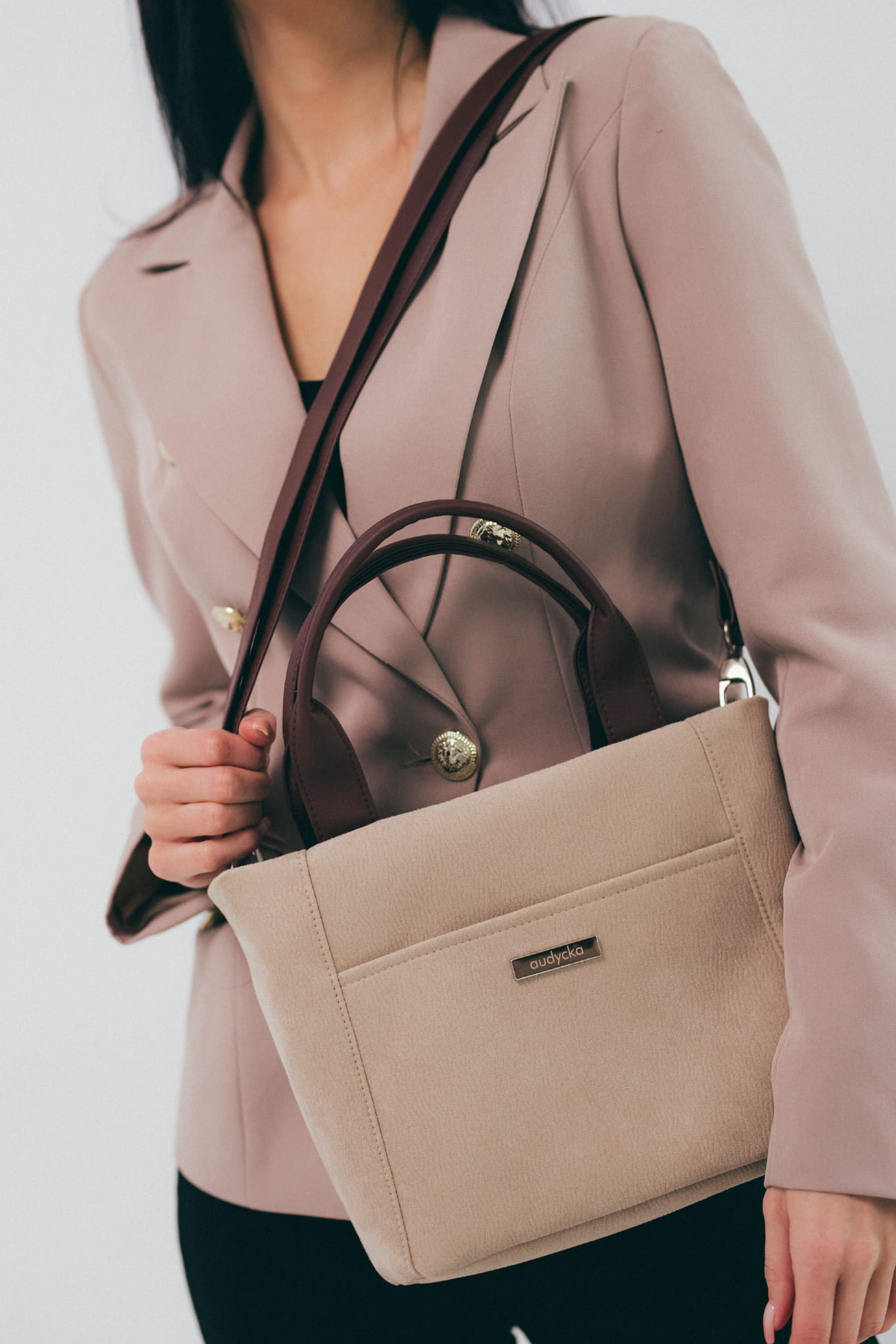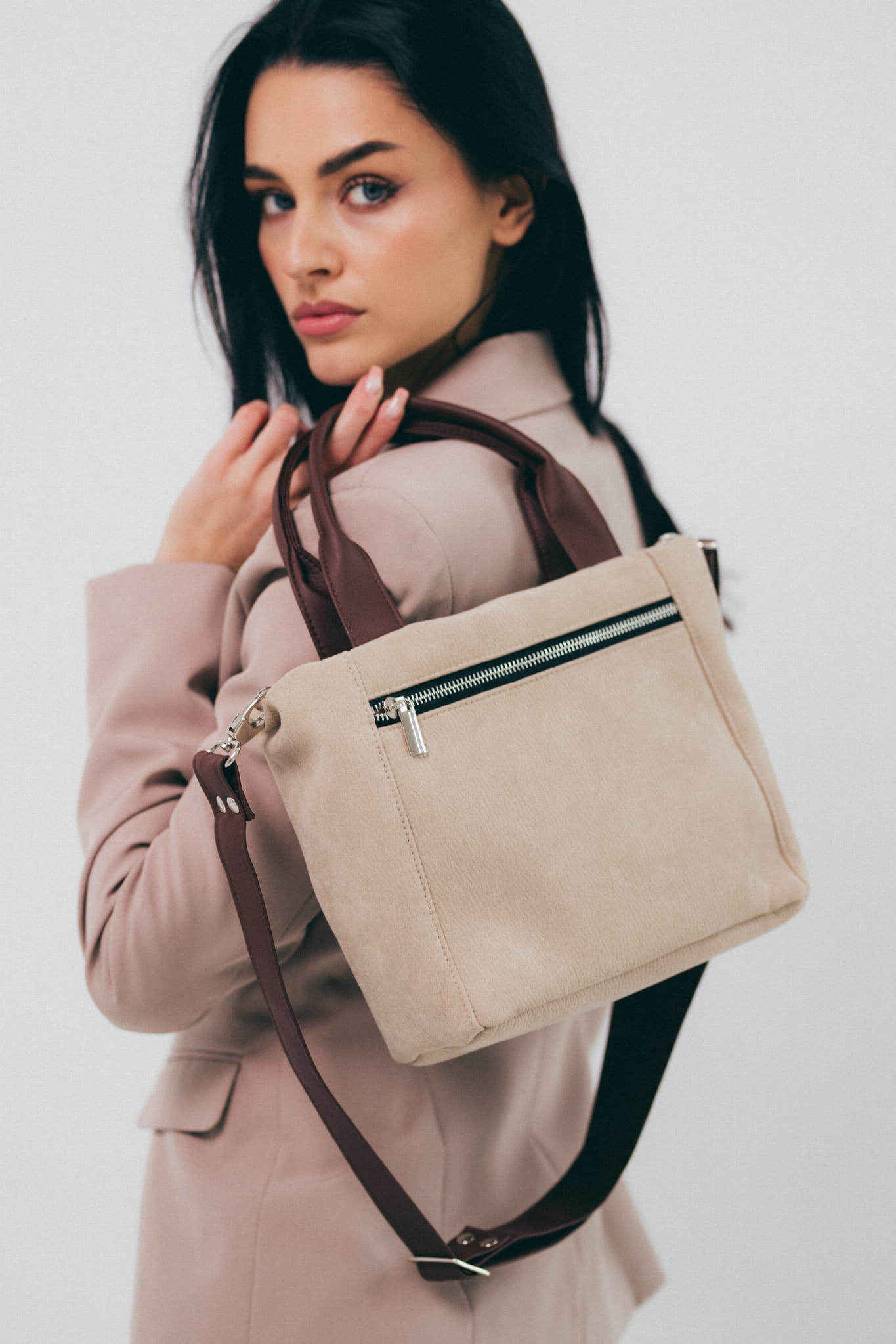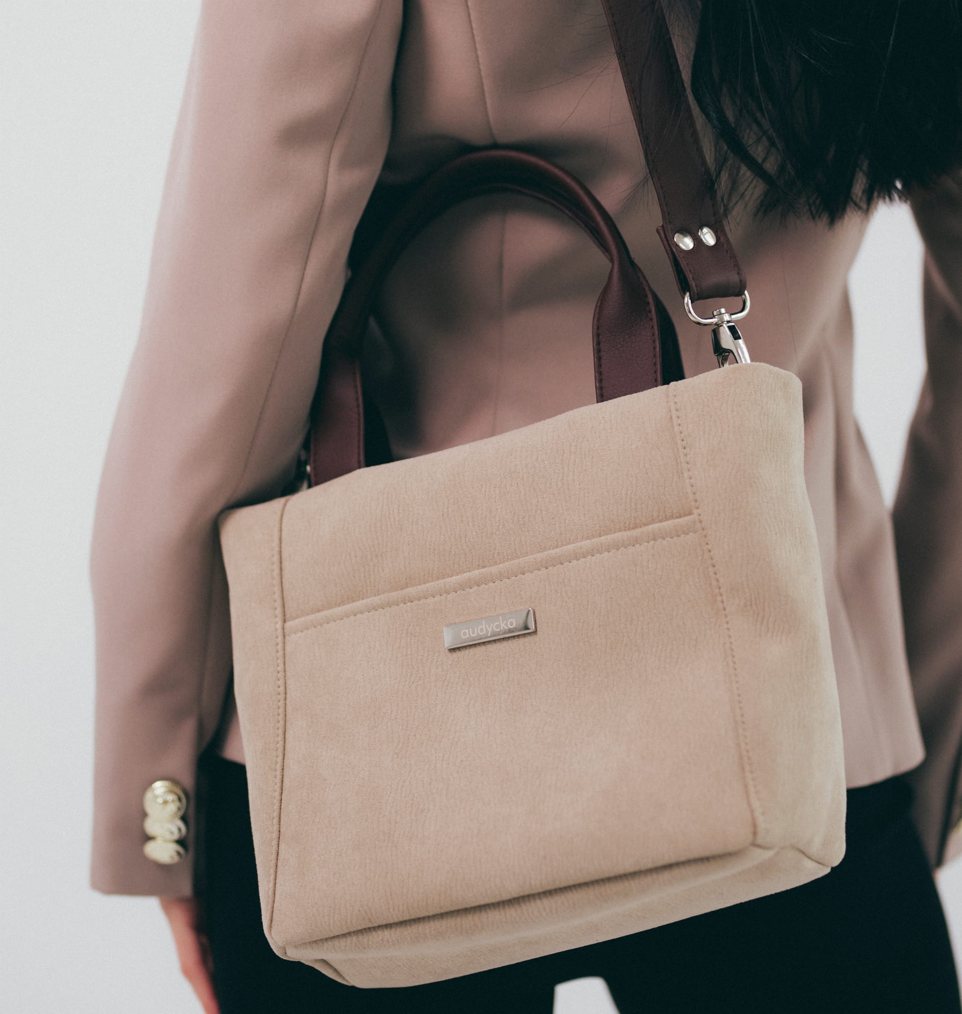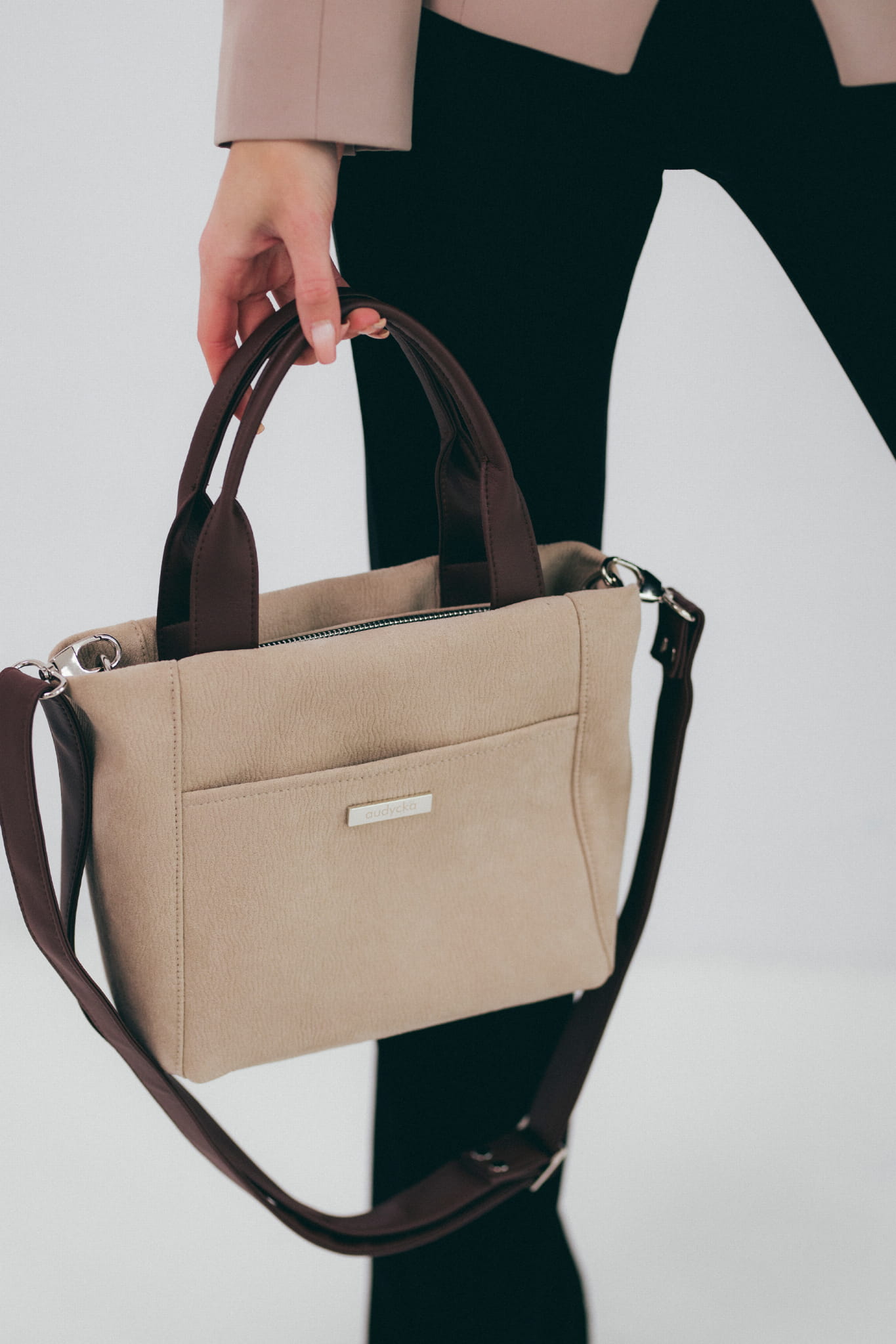 Eine kleine Tasche aus Öko-Nubuk-, um in der Hand, über der Schulter oder diagonal wie eine Umhängetasche zu tragen. Mit dem verstellbaren Riemen kann man die richtige Länge einstellen. Eine einzigartige Handtasche aus schönem Stoff eignet sich perfekt als formelle oder alltägliche Tasche. Ein A5-Notizbuch passt hinein und alle kleineren Gegenstände, in die beiden Außentaschen. Es passt perfekt zu jedem lässigen Styling. Der starke Stoff ist reibungs- und feuchtigkeitsbeständig.