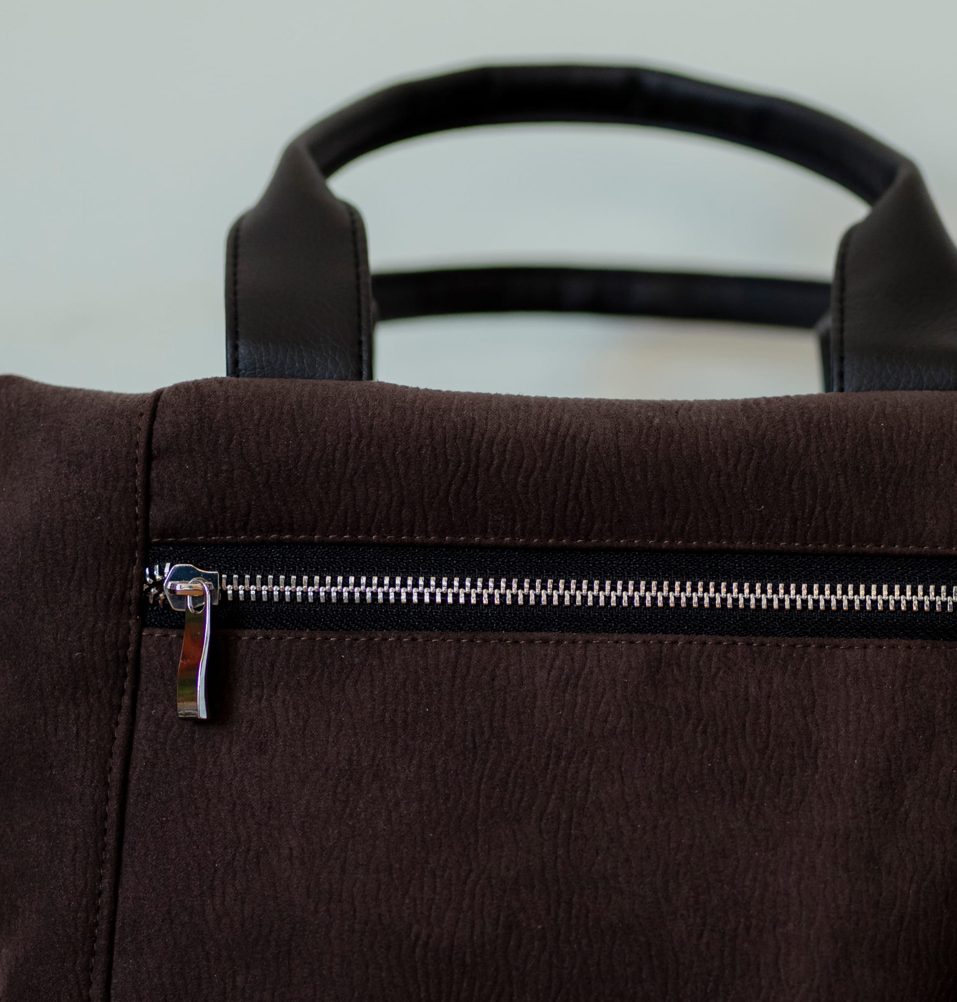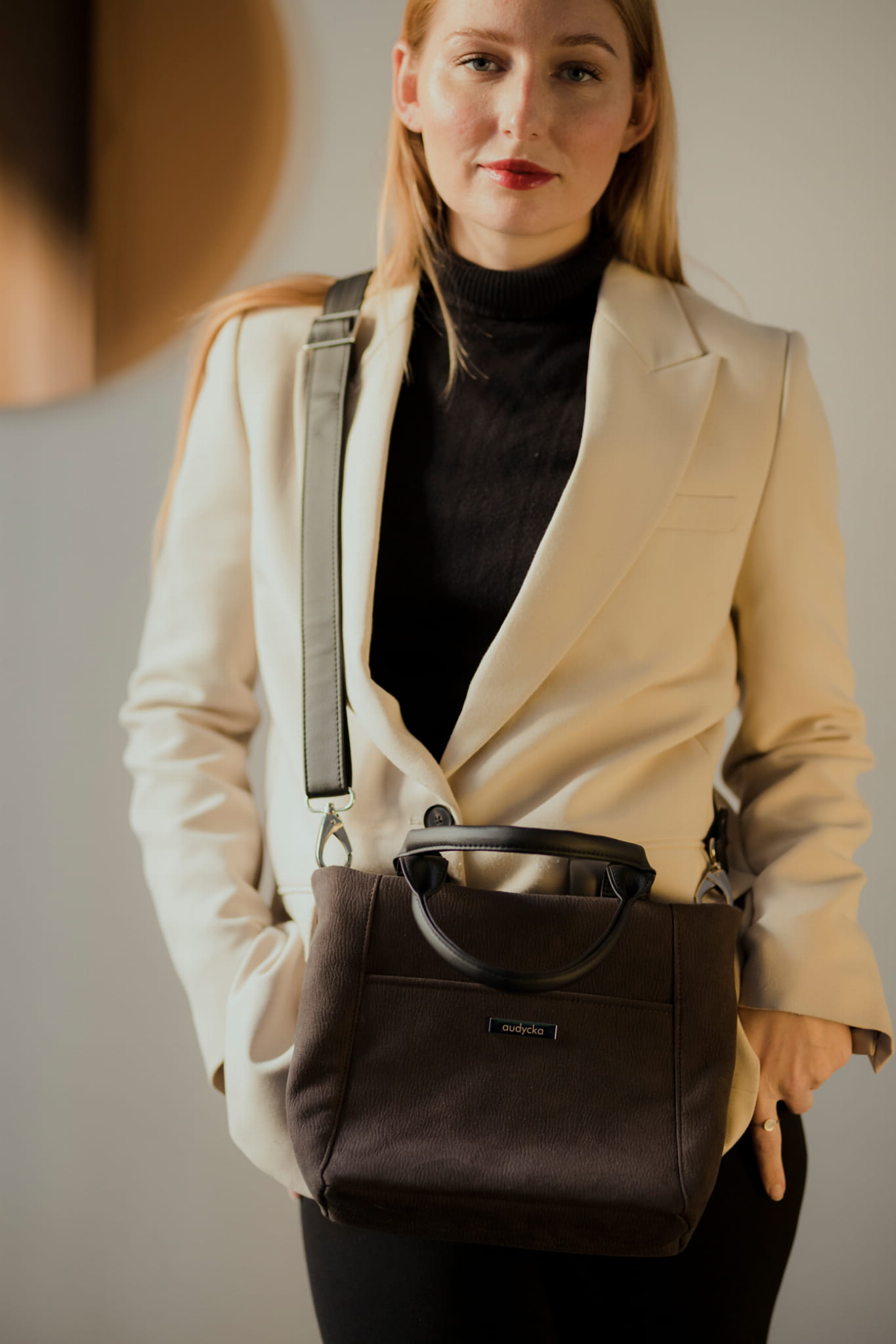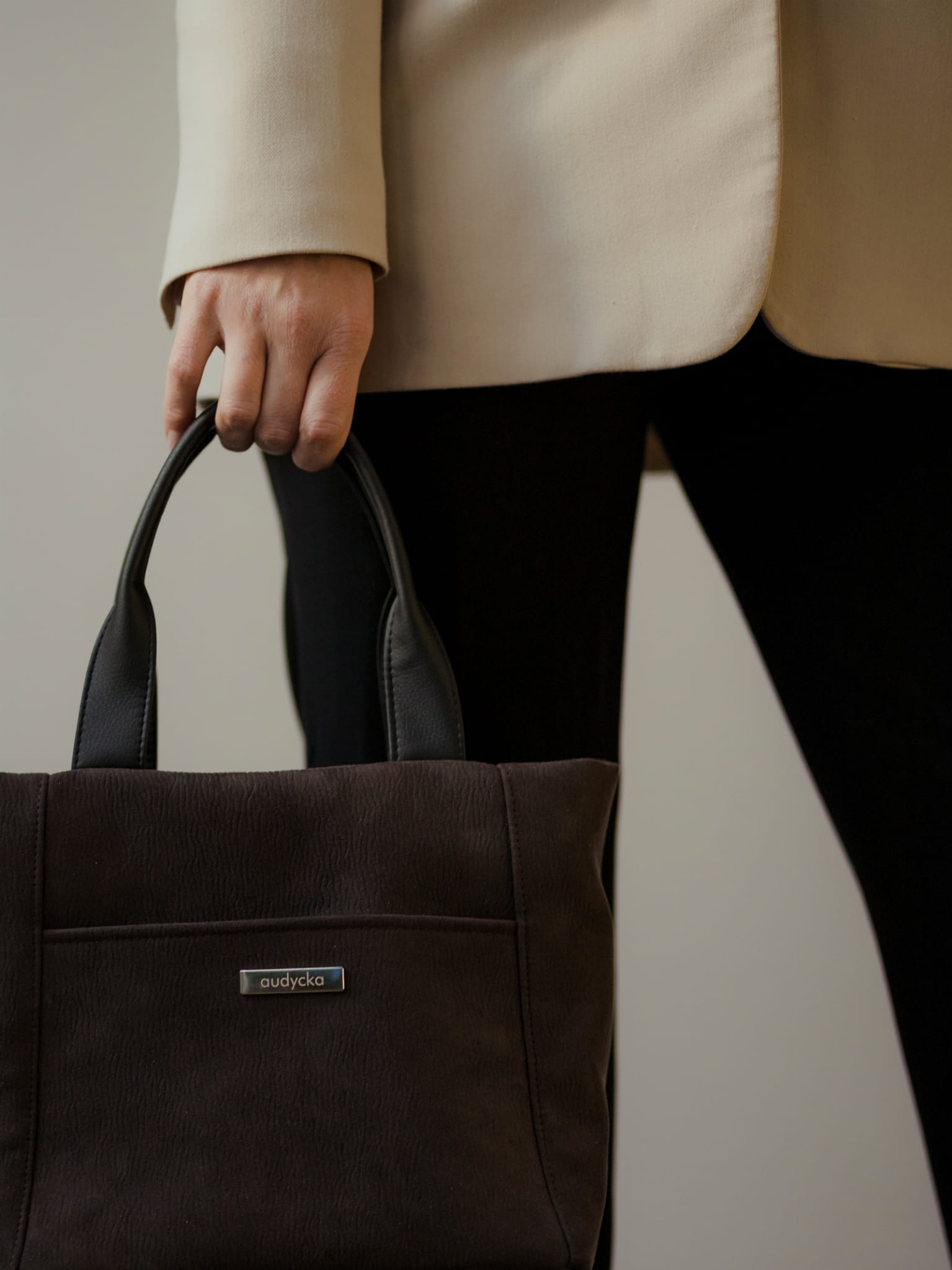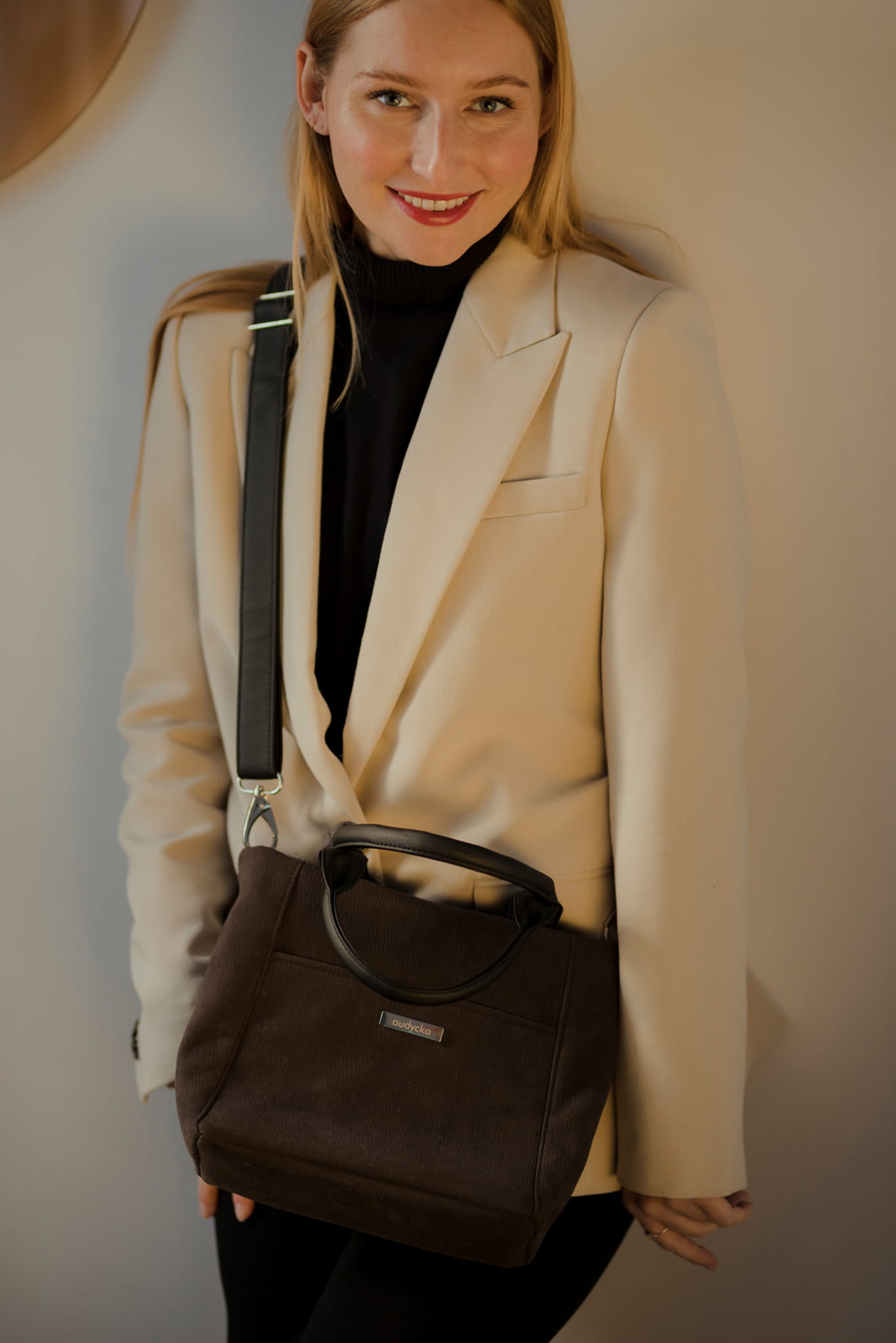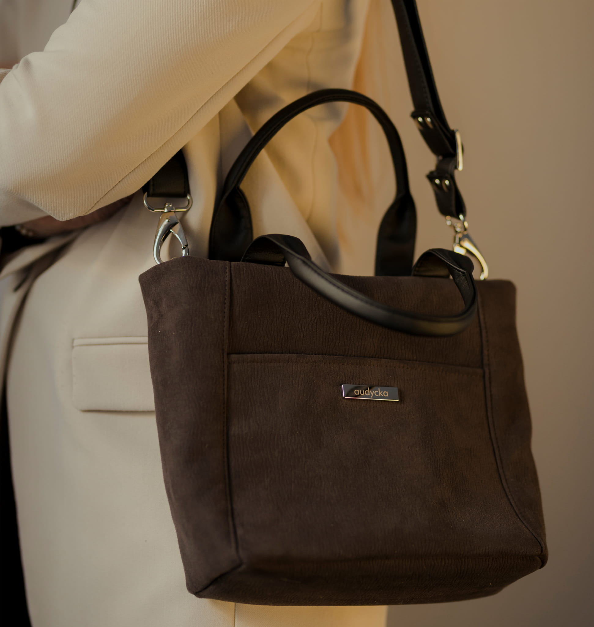 Eine kleine Tasche aus Öko-Nubuk-, um in der Hand, über der Schulter oder diagonal wie eine Umhängetasche zu tragen. Mit dem verstellbaren Riemen kann man die richtige Länge einstellen. Eine einzigartige Handtasche aus schönem Stoff eignet sich perfekt als formelle oder alltägliche Tasche. Ein A5-Notizbuch passt hinein und alle kleineren Gegenstände, in die beiden Außentaschen. Es passt perfekt zu jedem lässigen Styling. Der starke Stoff ist reibungs- und feuchtigkeitsbeständig.