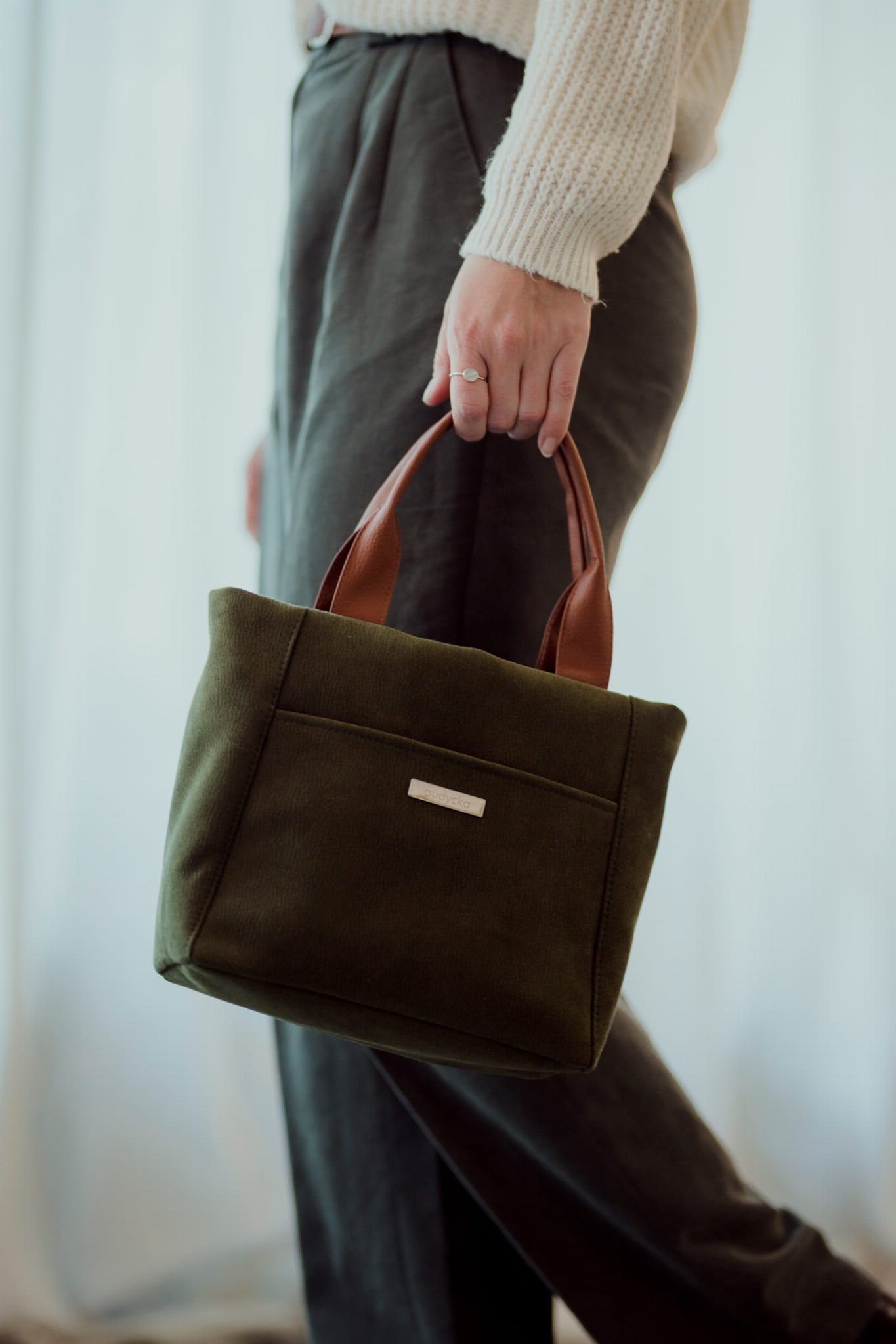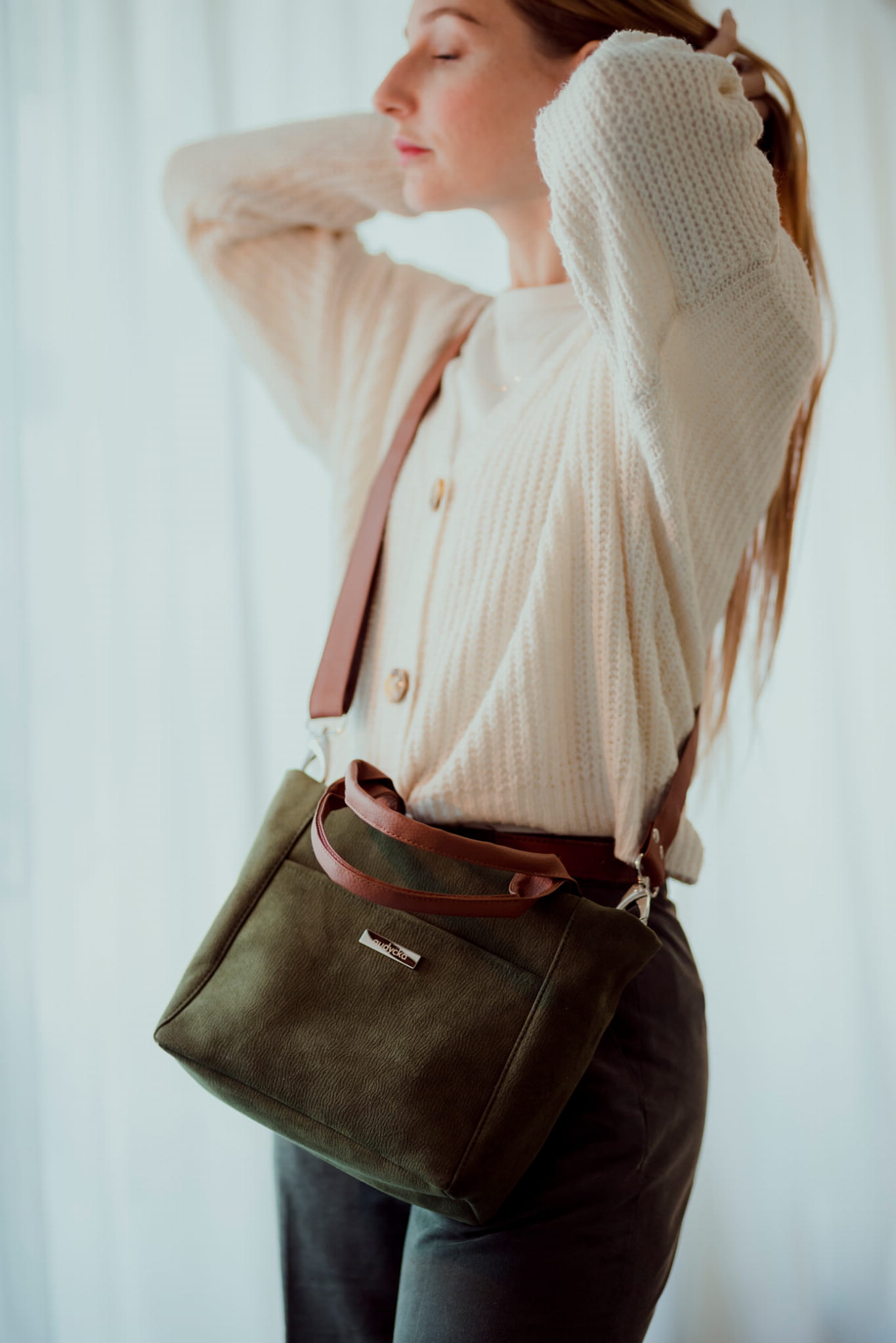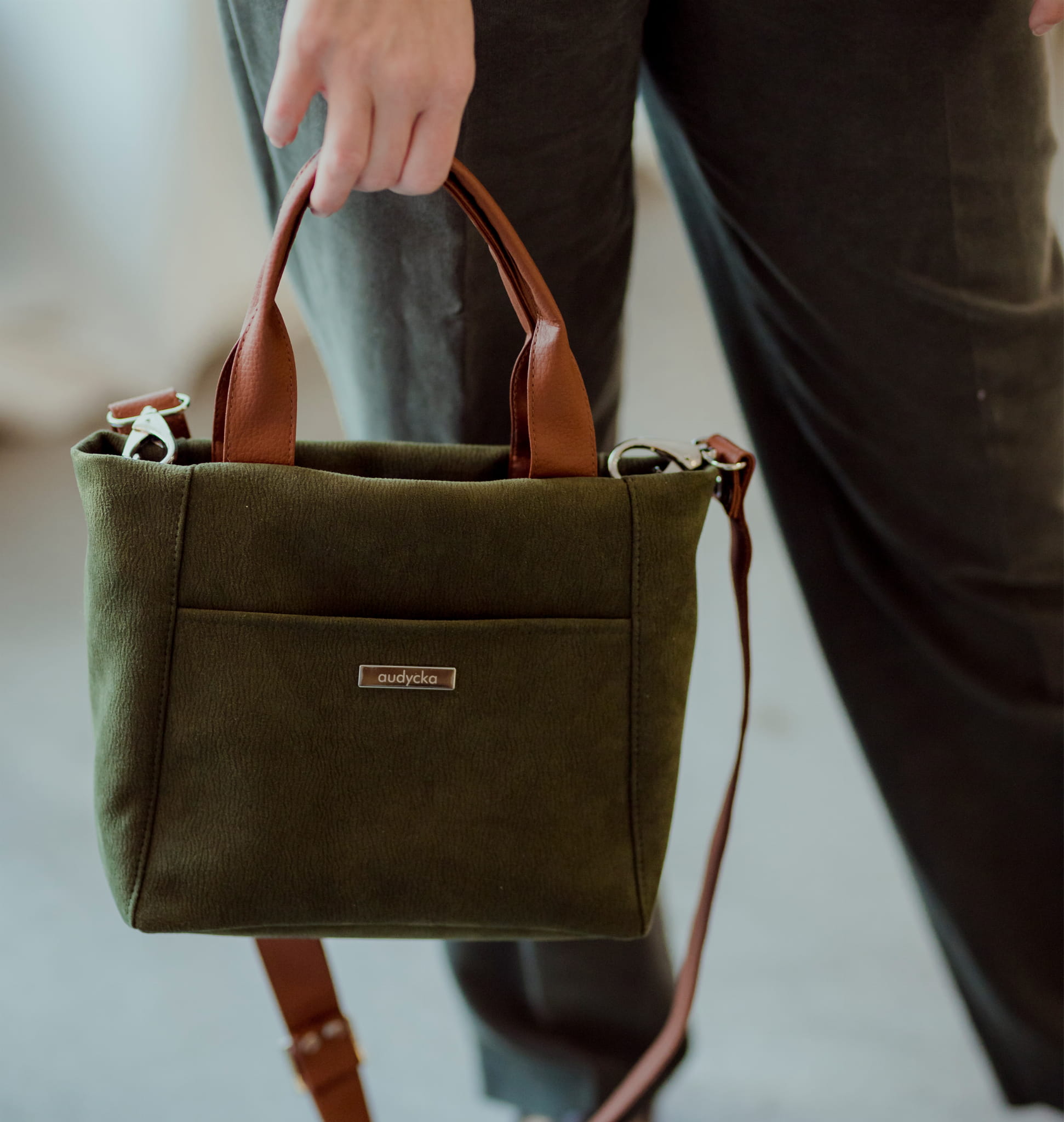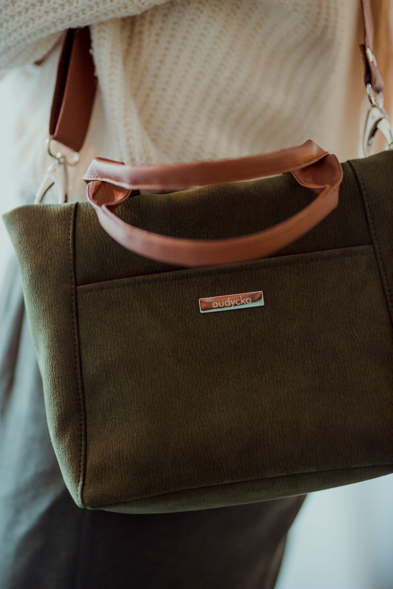 Eine kleine Tasche aus Öko-Nubuk-, um in der Hand, über der Schulter oder diagonal wie eine Umhängetasche zu tragen. Mit dem verstellbaren Riemen kann man die richtige Länge einstellen. Eine einzigartige Handtasche aus schönem Stoff eignet sich perfekt als formelle oder alltägliche Tasche. Ein A5-Notizbuch passt hinein und alle kleineren Gegenstände, in die beiden Außentaschen. Es passt perfekt zu jedem lässigen Styling. Der starke Stoff ist reibungs- und feuchtigkeitsbeständig.