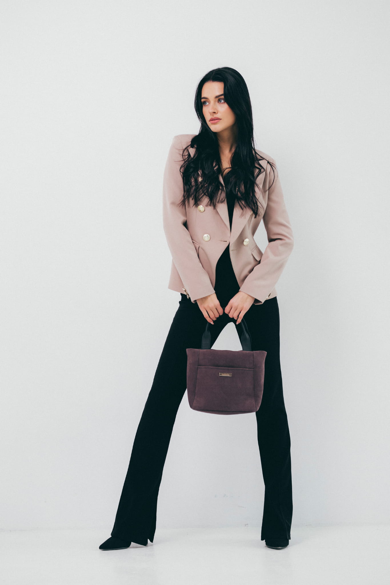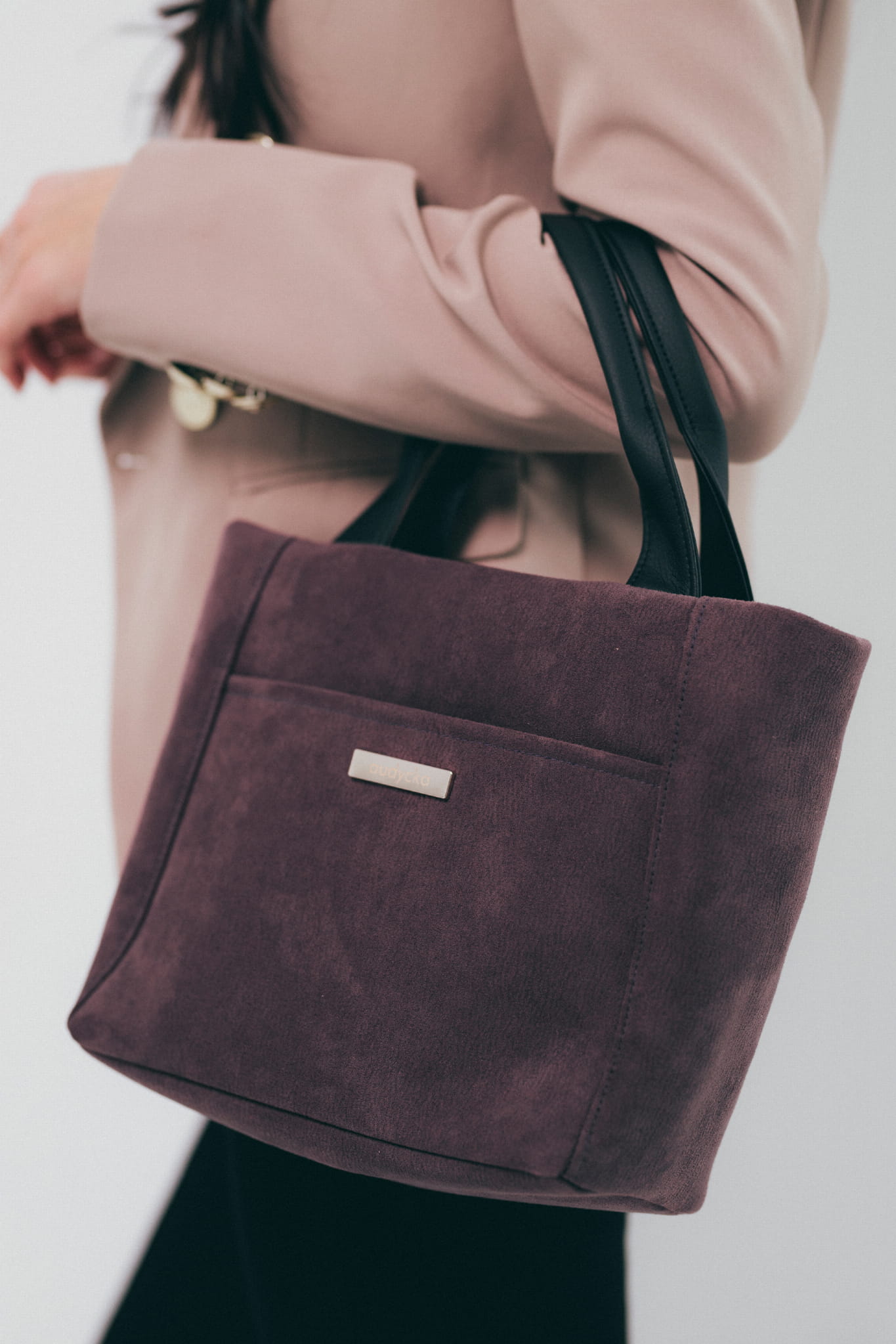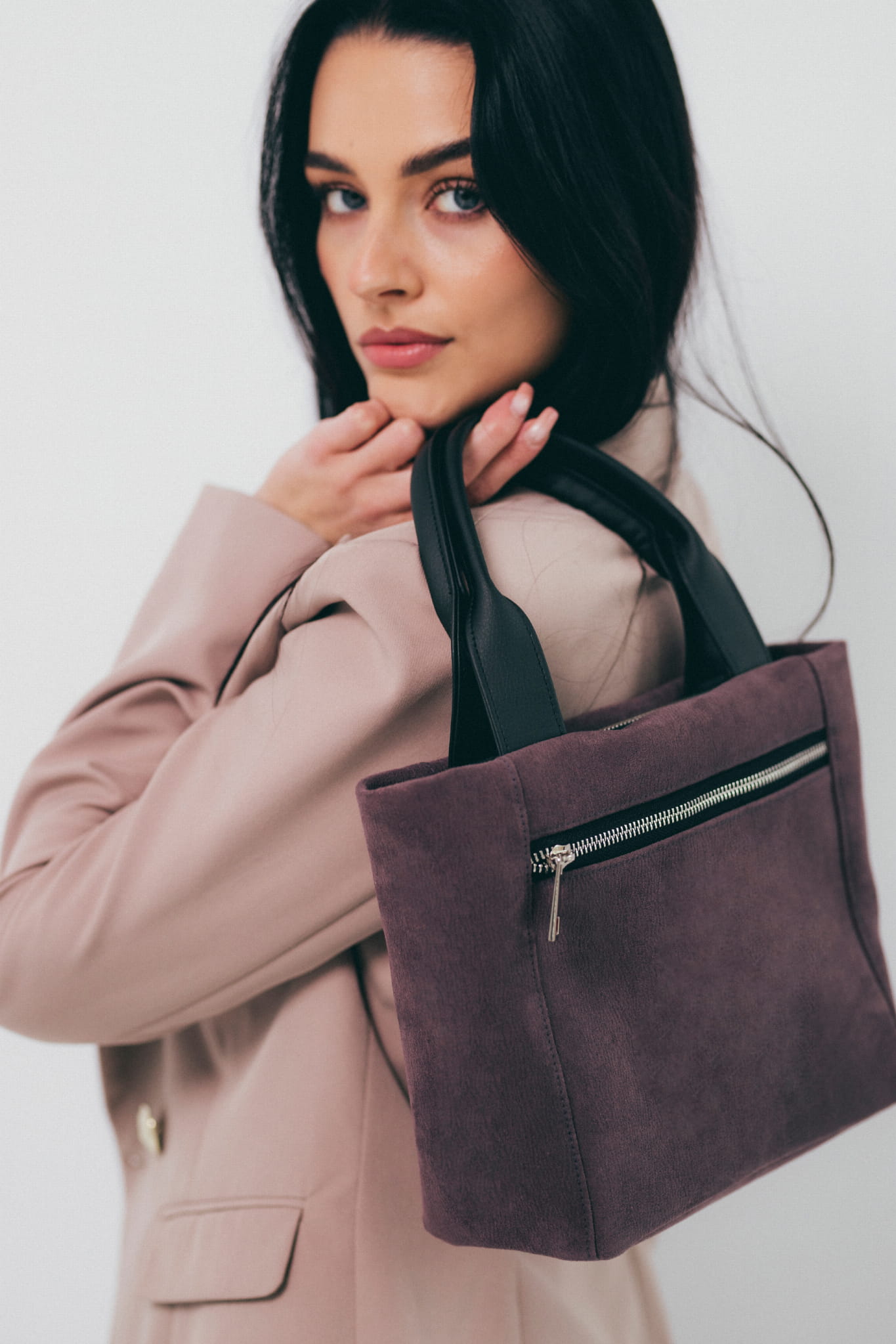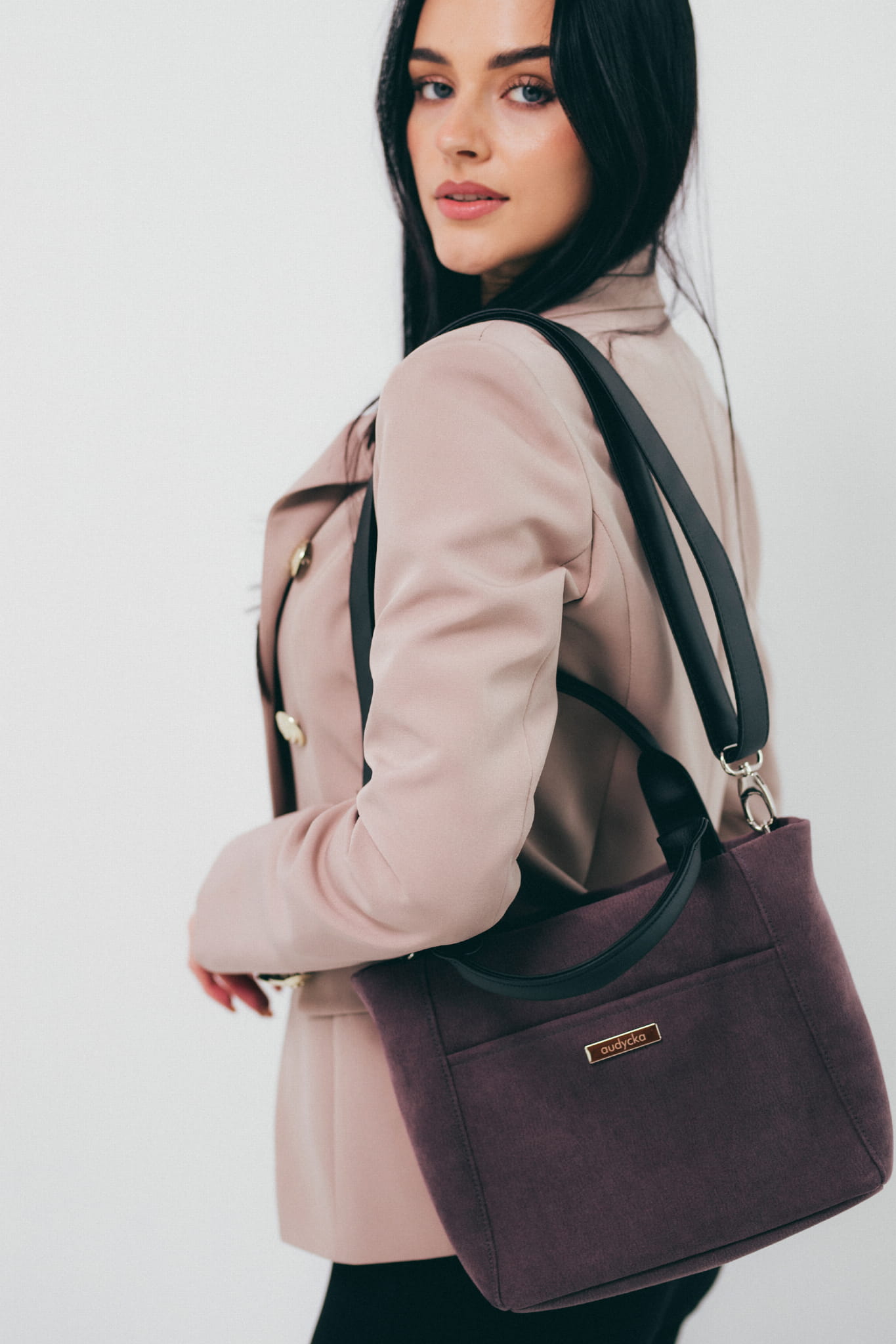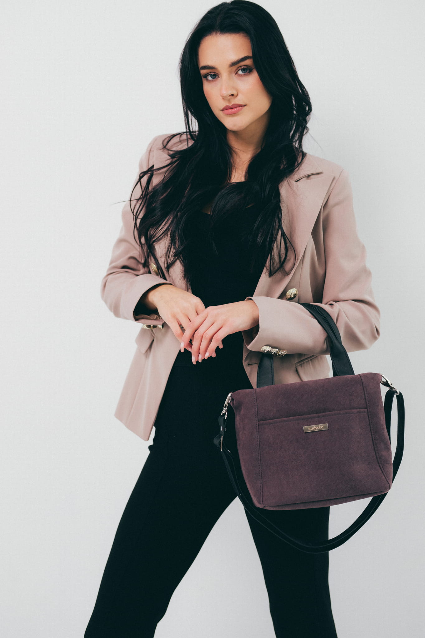 Eine kleine Tasche aus Öko-Nubuk-, um in der Hand, über der Schulter oder diagonal wie eine Umhängetasche zu tragen. Mit dem verstellbaren Riemen kann man die richtige Länge einstellen. Eine einzigartige Handtasche aus schönem Stoff eignet sich perfekt als formelle oder alltägliche Tasche. Ein A5-Notizbuch passt hinein und alle kleineren Gegenstände, in die beiden Außentaschen. Es passt perfekt zu jedem lässigen Styling. Der starke Stoff ist reibungs- und feuchtigkeitsbeständig.